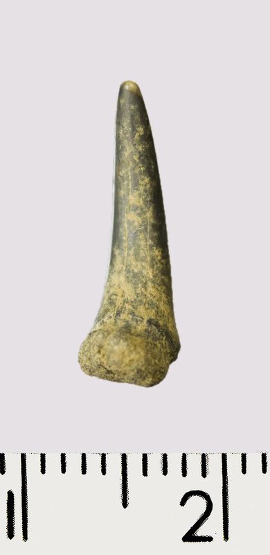 Зуб (фрагмент). Акула. Scapanorhynchus rhaphiodon Agassiz, 1843. Классификация: Хордовые Chordata, Позвоночные Vertebrata, Хрящевые рыбы Chondrichthyes, Пластиножаберные Elasmobranchii