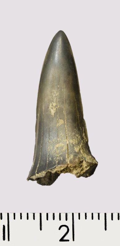 Зуб (фрагмент). Акула. Scapanorhynchus gigas Woodward, 1889. Классификация: Хордовые Chordata, Позвоночные Vertebrata, Хрящевые рыбы Chondrichthyes, Пластиножаберные Elasmobranchii