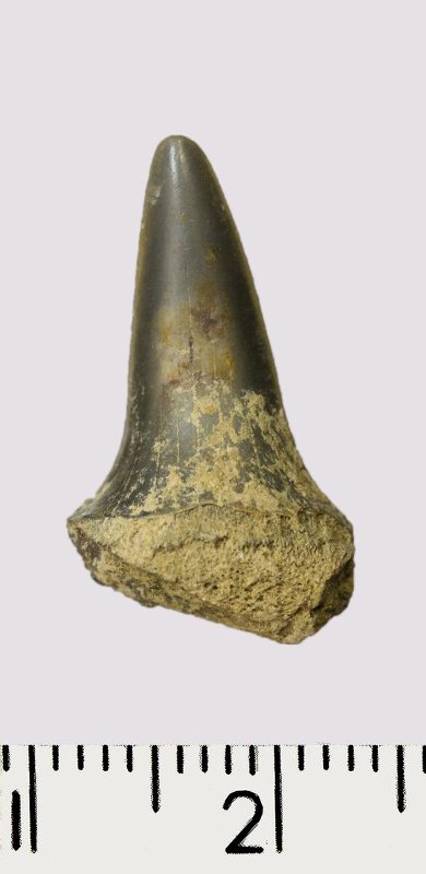 Зуб (фрагмент). Акула. Scapanorhynchus gigas Woodward, 1889. Классификация: Хордовые Chordata, Позвоночные Vertebrata, Хрящевые рыбы Chondrichthyes, Пластиножаберные Elasmobranchii