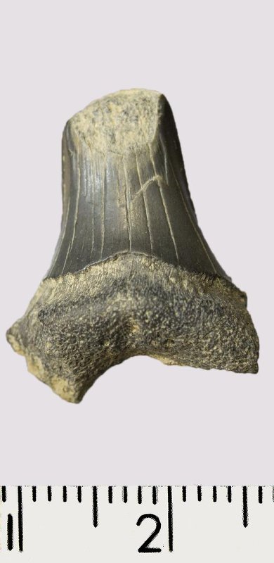Зуб. Акула. Scapanorhynchus gigas Woodward, 1889. Классификация: Хордовые Chordata, Позвоночные Vertebrata, Хрящевые рыбы Chondrichthyes, Пластиножаберные Elasmobranchii