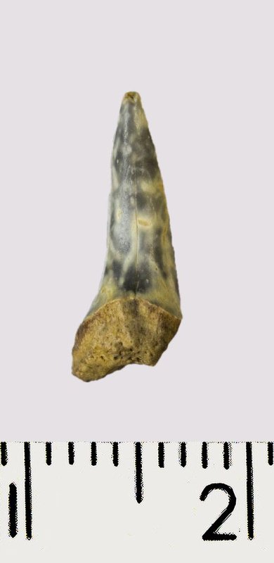 Зуб (фрагмент). Акула. Lamniformes gen. et sp. indet. Классификация: Хордовые Chordata, Позвоночные Vertebrata, Хрящевые рыбы Chondrichthyes, Пластиножаберные Elasmobranchii