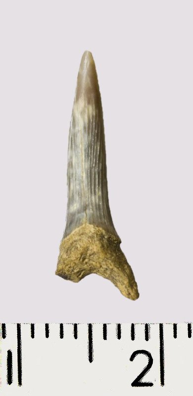 Зуб. Акула. Scapanorhynchus rhaphiodon Agassiz, 1843. Классификация: Хордовые Chordata, Позвоночные Vertebrata, Хрящевые рыбы Chondrichthyes, Пластиножаберные Elasmobranchii