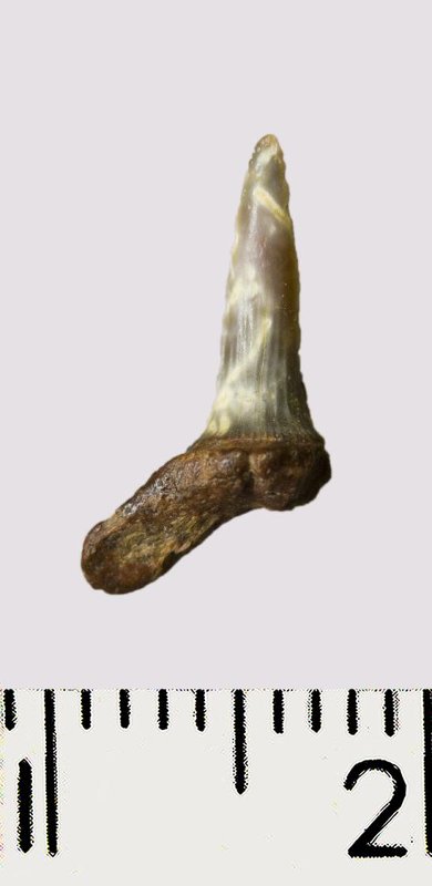 Зуб. Акула. Scapanorhynchus rhaphiodon Agassiz, 1843. Классификация: Хордовые Chordata, Позвоночные Vertebrata, Хрящевые рыбы Chondrichthyes, Пластиножаберные Elasmobranchii