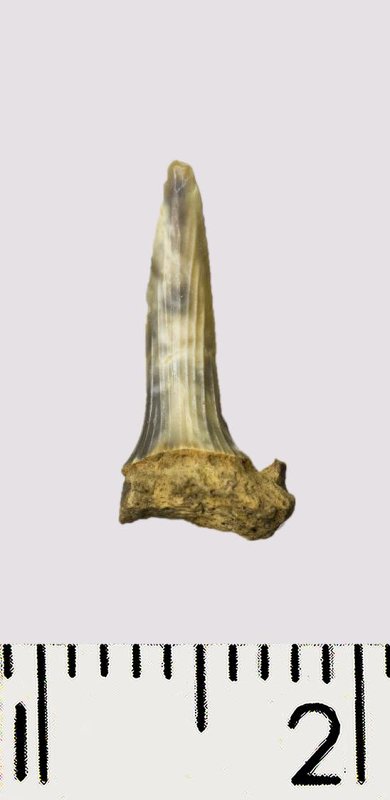 Зуб. Акула. Scapanorhynchus rhaphiodon Agassiz, 1843. Классификация: Хордовые Chordata, Позвоночные Vertebrata, Хрящевые рыбы Chondrichthyes, Пластиножаберные Elasmobranchii