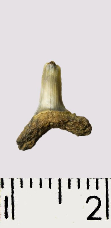 Зуб. Акула. Scapanorhynchus rhaphiodon Agassiz, 1843. Классификация: Хордовые Chordata, Позвоночные Vertebrata, Хрящевые рыбы Chondrichthyes, Пластиножаберные Elasmobranchii