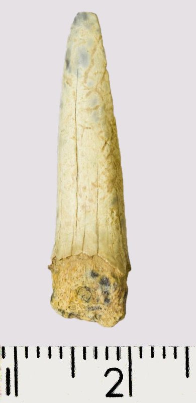 Зуб (фрагмент). Акула. Scapanorhynchus gigas Woodward, 1889. Классификация: Хордовые Chordata, Позвоночные Vertebrata, Хрящевые рыбы Chondrichthyes, Пластиножаберные Elasmobranchii
