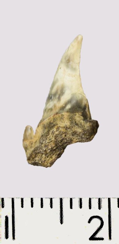 Зуб. Акула. Odontaspis macrorhiza (Cope) Leriche, 1902. Классификация: Хордовые Chordata, Позвоночные Vertebrata, Хрящевые рыбы Chondrichthyes, Пластиножаберные Elasmobranchii
