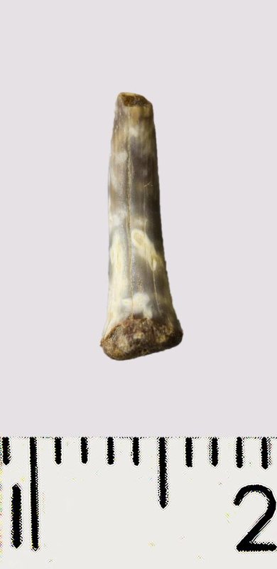 Зуб (фрагмент). Акула. Scapanorhynchus rhaphiodon Agassiz, 1843. Классификация: Хордовые Chordata, Позвоночные Vertebrata, Хрящевые рыбы Chondrichthyes, Пластиножаберные Elasmobranchii