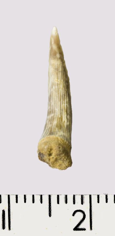 Зуб (фрагмент). Акула. Scapanorhynchus rhaphiodon Agassiz, 1843. Классификация: Хордовые Chordata, Позвоночные Vertebrata, Хрящевые рыбы Chondrichthyes, Пластиножаберные Elasmobranchii