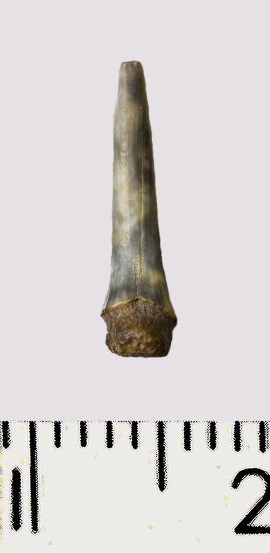 Зуб (фрагмент). Акула. Scapanorhynchus rhaphiodon Agassiz, 1843. Классификация: Хордовые Chordata, Позвоночные Vertebrata, Хрящевые рыбы Chondrichthyes, Пластиножаберные Elasmobranchii