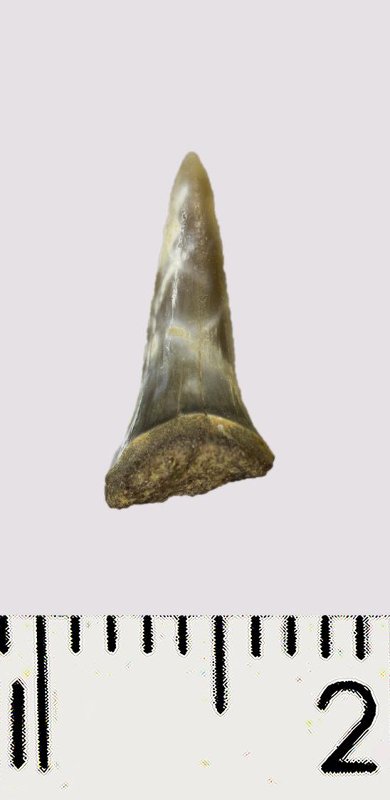 Зуб (фрагмент). Акула. Scapanorhynchus rhaphiodon Agassiz, 1843. Классификация: Хордовые Chordata, Позвоночные Vertebrata, Хрящевые рыбы Chondrichthyes, Пластиножаберные Elasmobranchii