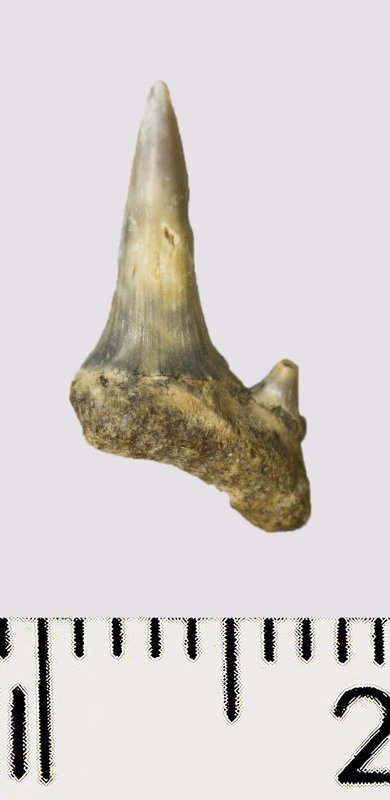 Зуб. Акула. Scapanorhynchus rhaphiodon Agassiz, 1843. Классификация: Хордовые Chordata, Позвоночные Vertebrata, Хрящевые рыбы Chondrichthyes, Пластиножаберные Elasmobranchii