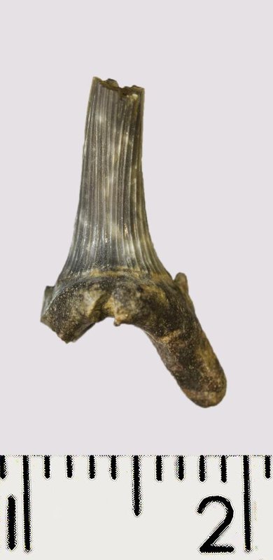 Зуб. Акула. Scapanorhynchus rhaphiodon Agassiz, 1843. Классификация: Хордовые Chordata, Позвоночные Vertebrata, Хрящевые рыбы Chondrichthyes, Пластиножаберные Elasmobranchii