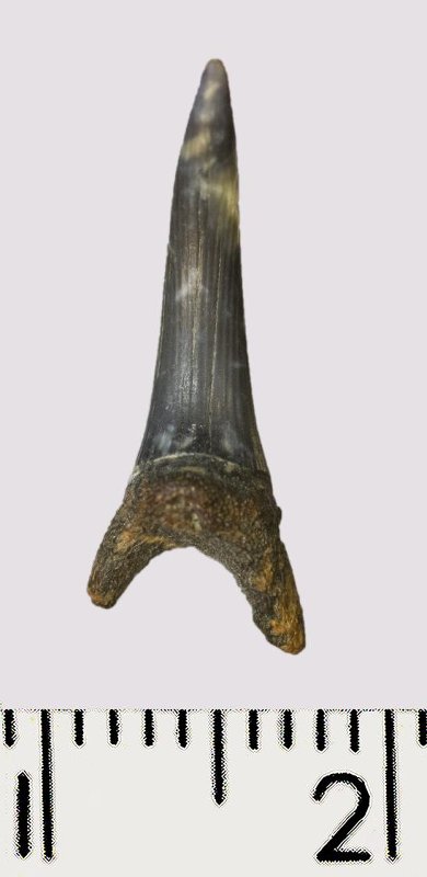 Зуб. Акула. Scapanorhynchus rhaphiodon Agassiz, 1843. Классификация: Хордовые Chordata, Позвоночные Vertebrata, Хрящевые рыбы Chondrichthyes, Пластиножаберные Elasmobranchii