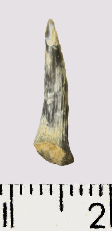 Зуб (фрагмент). Акула. Scapanorhynchus rhaphiodon Agassiz, 1843. Классификация: Хордовые Chordata, Позвоночные Vertebrata, Хрящевые рыбы Chondrichthyes, Пластиножаберные Elasmobranchii