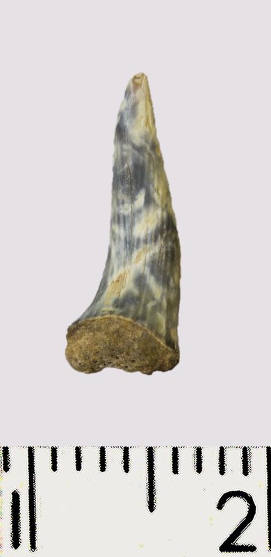 Зуб (фрагмент). Акула. Scapanorhynchus rhaphiodon Agassiz, 1843. Классификация: Хордовые Chordata, Позвоночные Vertebrata, Хрящевые рыбы Chondrichthyes, Пластиножаберные Elasmobranchii