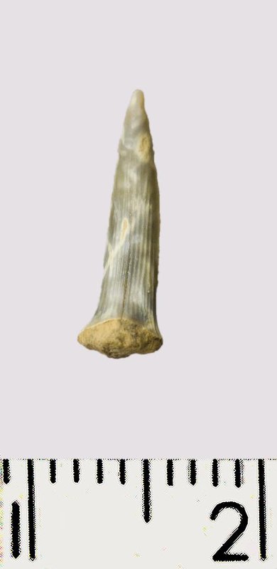 Зуб (фрагмент). Акула. Scapanorhynchus rhaphiodon Agassiz, 1843. Классификация: Хордовые Chordata, Позвоночные Vertebrata, Хрящевые рыбы Chondrichthyes, Пластиножаберные Elasmobranchii