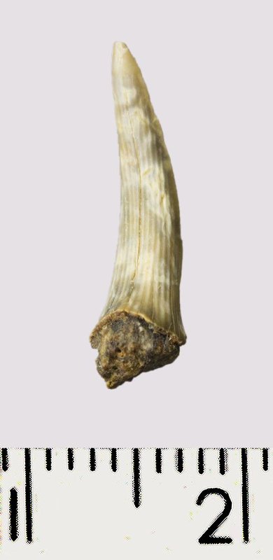 Зуб (фрагмент). Акула. Scapanorhynchus rhaphiodon Agassiz, 1843. Классификация: Хордовые Chordata, Позвоночные Vertebrata, Хрящевые рыбы Chondrichthyes, Пластиножаберные Elasmobranchii