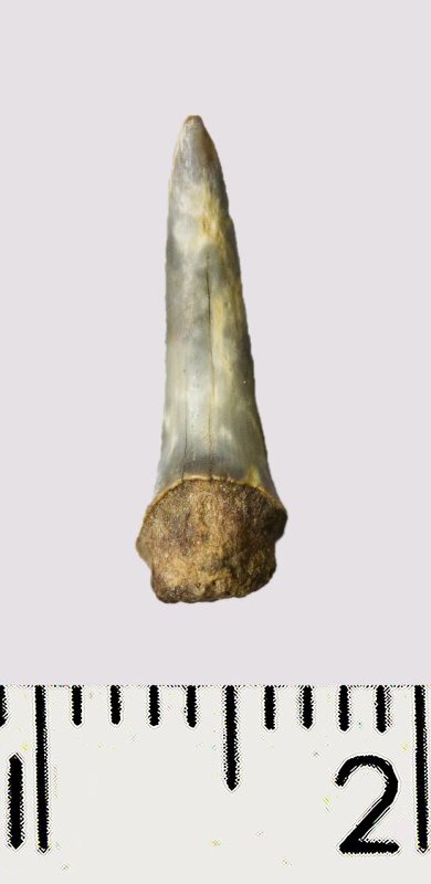 Зуб (фрагмент). Акула. Scapanorhynchus rhaphiodon Agassiz, 1843. Классификация: Хордовые Chordata, Позвоночные Vertebrata, Хрящевые рыбы Chondrichthyes, Пластиножаберные Elasmobranchii