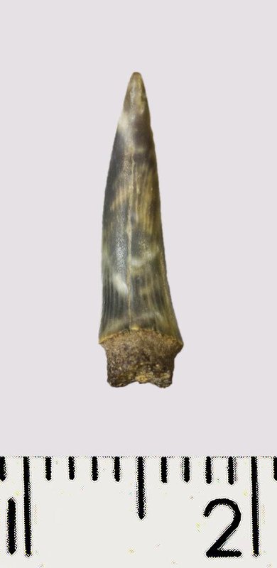 Зуб (фрагмент). Акула. Scapanorhynchus rhaphiodon Agassiz, 1843. Классификация: Хордовые Chordata, Позвоночные Vertebrata, Хрящевые рыбы Chondrichthyes, Пластиножаберные Elasmobranchii
