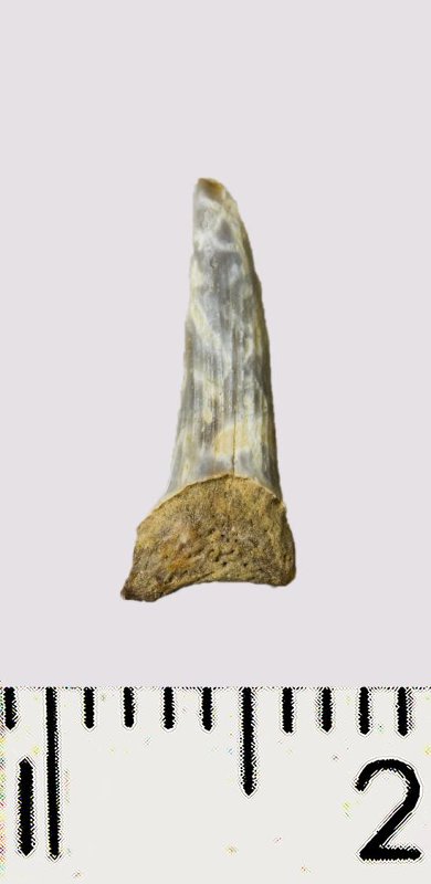 Зуб (фрагмент). Акула. Scapanorhynchus rhaphiodon Agassiz, 1843. Классификация: Хордовые Chordata, Позвоночные Vertebrata, Хрящевые рыбы Chondrichthyes, Пластиножаберные Elasmobranchii