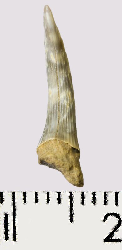 Зуб. Акула. Scapanorhynchus rhaphiodon Agassiz, 1843. Классификация: Хордовые Chordata, Позвоночные Vertebrata, Хрящевые рыбы Chondrichthyes, Пластиножаберные Elasmobranchii