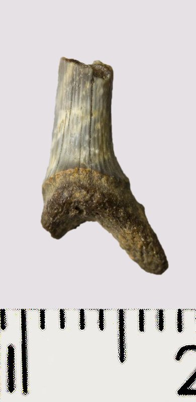 Зуб. Акула. Scapanorhynchus rhaphiodon Agassiz, 1843. Классификация: Хордовые Chordata, Позвоночные Vertebrata, Хрящевые рыбы Chondrichthyes, Пластиножаберные Elasmobranchii