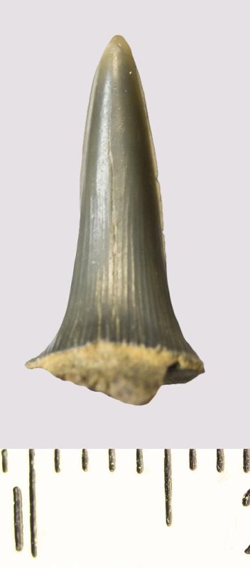 Зуб (фрагмент). Акула. Scapanorhynchus rhaphiodon Agassiz, 1843. Классификация: Хордовые Chordata, Позвоночные Vertebrata, Хрящевые рыбы Chondrichthyes, Пластиножаберные Elasmobranchii
