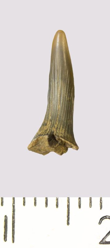 Зуб (фрагмент). Акула. Scapanorhynchus rhaphiodon Agassiz, 1843. Классификация: Хордовые Chordata, Позвоночные Vertebrata, Хрящевые рыбы Chondrichthyes, Пластиножаберные Elasmobranchii