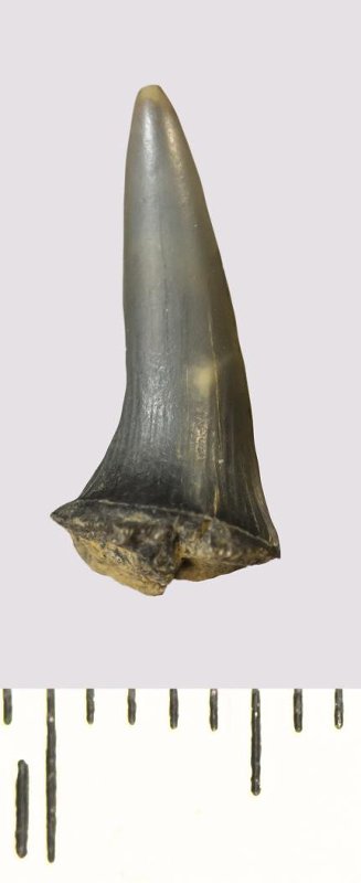 Зуб (фрагмент). Акула. Scapanorhynchus rhaphiodon Agassiz, 1843. Классификация: Хордовые Chordata, Позвоночные Vertebrata, Хрящевые рыбы Chondrichthyes, Пластиножаберные Elasmobranchii