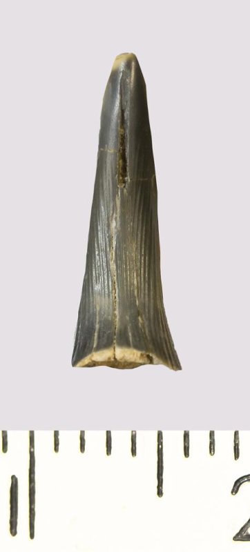 Зуб (фрагмент). Акула. Scapanorhynchus rhaphiodon Agassiz, 1843. Классификация: Хордовые Chordata, Позвоночные Vertebrata, Хрящевые рыбы Chondrichthyes, Пластиножаберные Elasmobranchii