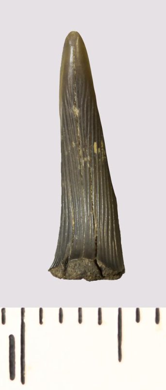 Зуб (фрагмент). Акула. Scapanorhynchus rhaphiodon Agassiz, 1843. Классификация: Хордовые Chordata, Позвоночные Vertebrata, Хрящевые рыбы Chondrichthyes, Пластиножаберные Elasmobranchii