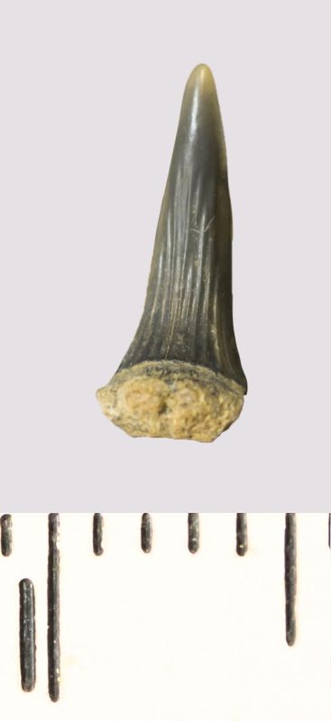 Зуб (фрагмент). Акула. Scapanorhynchus rhaphiodon Agassiz, 1843. Классификация: Хордовые Chordata, Позвоночные Vertebrata, Хрящевые рыбы Chondrichthyes, Пластиножаберные Elasmobranchii