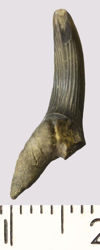 Зуб. Акула. Scapanorhynchus rhaphiodon Agassiz, 1843. Классификация: Хордовые Chordata, Позвоночные Vertebrata, Хрящевые рыбы Chondrichthyes, Пластиножаберные Elasmobranchii
