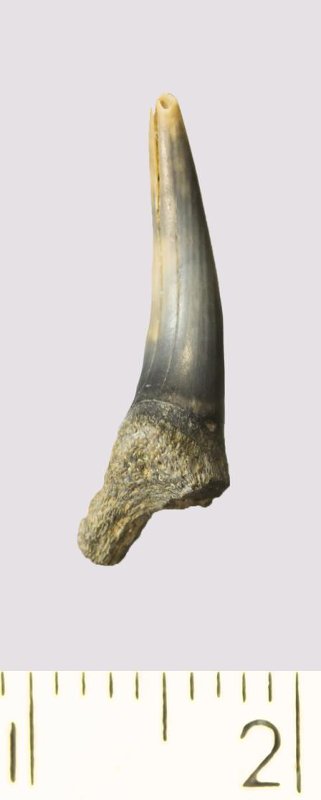 Зуб. Акула. Scapanorhynchus rhaphiodon Agassiz, 1843. Классификация: Хордовые Chordata, Позвоночные Vertebrata, Хрящевые рыбы Chondrichthyes, Пластиножаберные Elasmobranchii