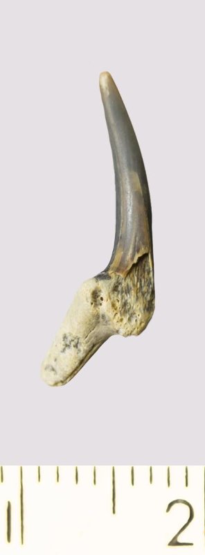 Зуб. Акула. Scapanorhynchus rhaphiodon Agassiz, 1843. Классификация: Хордовые Chordata, Позвоночные Vertebrata, Хрящевые рыбы Chondrichthyes, Пластиножаберные Elasmobranchii