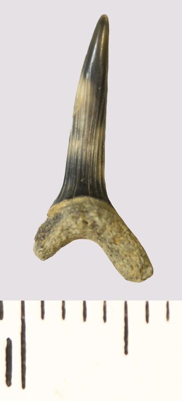 Зуб. Акула. Scapanorhynchus rhaphiodon Agassiz, 1843. Классификация: Хордовые Chordata, Позвоночные Vertebrata, Хрящевые рыбы Chondrichthyes, Пластиножаберные Elasmobranchii