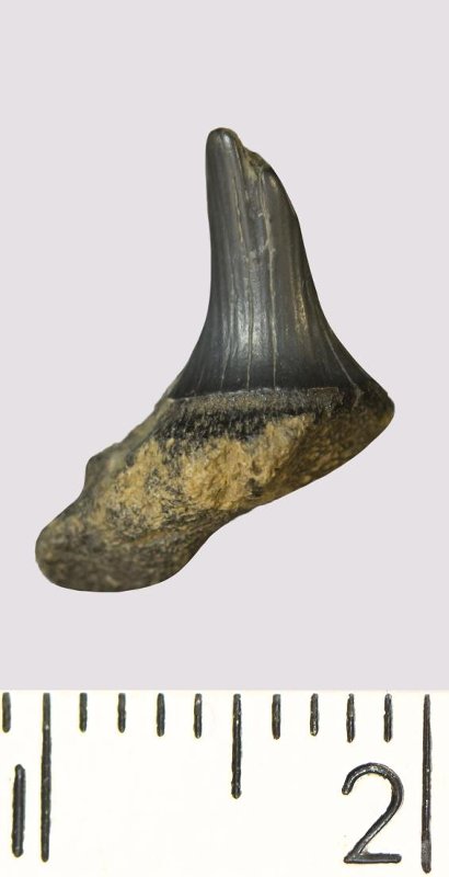 Зуб. Акула. Scapanorhynchus rhaphiodon Agassiz, 1843. Классификация: Хордовые Chordata, Позвоночные Vertebrata, Хрящевые рыбы Chondrichthyes, Пластиножаберные Elasmobranchii