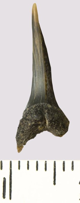 Зуб. Акула. Scapanorhynchus rhaphiodon Agassiz, 1843. Классификация: Хордовые Chordata, Позвоночные Vertebrata, Хрящевые рыбы Chondrichthyes, Пластиножаберные Elasmobranchii