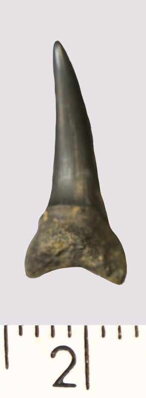 Зуб. Акула. Scapanorhynchus rhaphiodon Agassiz, 1843. Классификация: Хордовые Chordata, Позвоночные Vertebrata, Хрящевые рыбы Chondrichthyes, Пластиножаберные Elasmobranchii