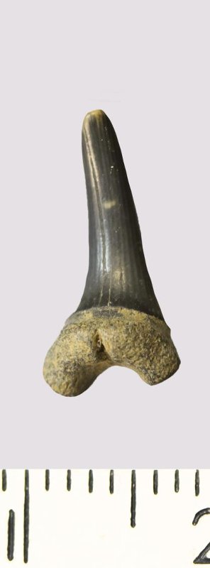 Зуб. Акула. Scapanorhynchus rhaphiodon Agassiz, 1843. Классификация: Хордовые Chordata, Позвоночные Vertebrata, Хрящевые рыбы Chondrichthyes, Пластиножаберные Elasmobranchii