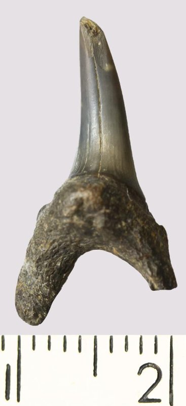 Зуб. Акула. Scapanorhynchus rhaphiodon Agassiz, 1843. Классификация: Хордовые Chordata, Позвоночные Vertebrata, Хрящевые рыбы Chondrichthyes, Пластиножаберные Elasmobranchii