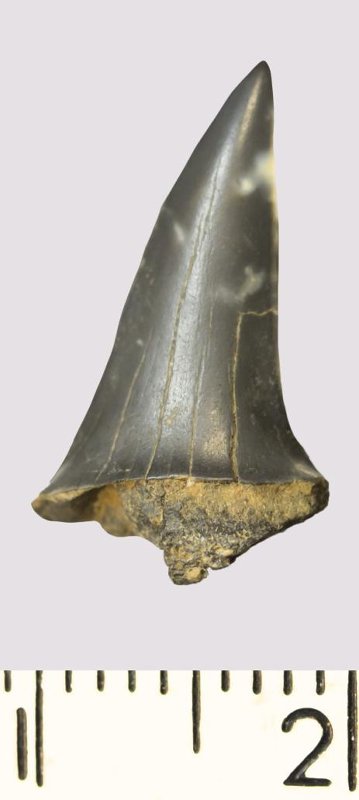 Зуб (фрагмент). Акула. Scapanorhynchus gigas Woodward, 1889. Классификация: Хордовые Chordata, Позвоночные Vertebrata, Хрящевые рыбы Chondrichthyes, Пластиножаберные Elasmobranchii