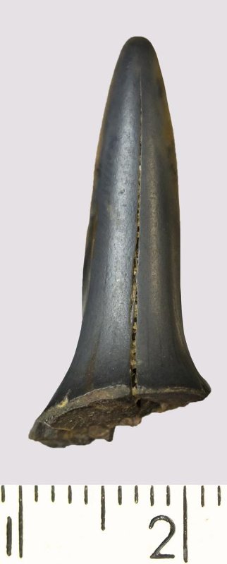 Зуб (фрагмент). Акула. Scapanorhynchus gigas Woodward, 1889. Классификация: Хордовые Chordata, Позвоночные Vertebrata, Хрящевые рыбы Chondrichthyes, Пластиножаберные Elasmobranchii