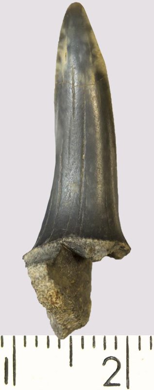 Зуб (фрагмент). Акула. Scapanorhynchus gigas Woodward, 1889. Классификация: Хордовые Chordata, Позвоночные Vertebrata, Хрящевые рыбы Chondrichthyes, Пластиножаберные Elasmobranchii