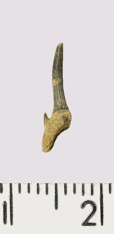 Зуб (фрагмент). Акула. Scapanorhynchus rhaphiodon Agassiz, 1843. Классификация: Хордовые Chordata, Позвоночные Vertebrata, Хрящевые рыбы Chondrichthyes, Пластиножаберные Elasmobranchii