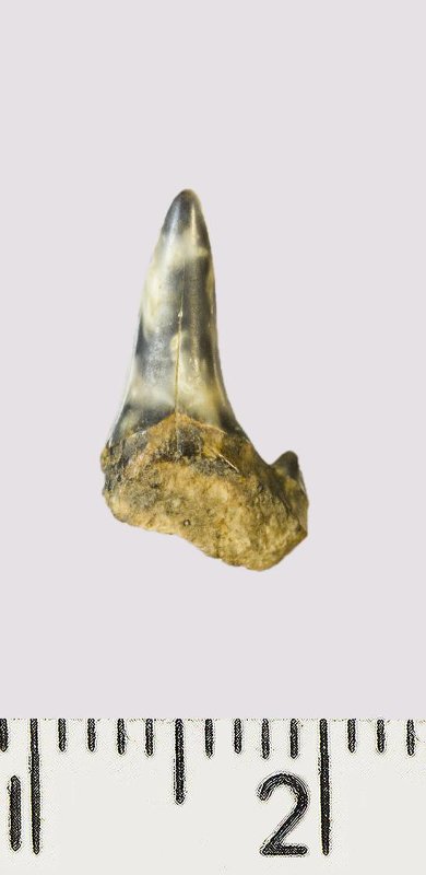 Зуб (фрагмент). Акула. Lamniformes gen. et sp. indet. Классификация: Хордовые Chordata, Позвоночные Vertebrata, Хрящевые рыбы Chondrichthyes, Пластиножаберные Elasmobranchii
