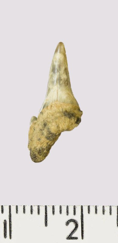 Зуб. Акула. Odontaspis macrorhiza (Cope) Leriche, 1902. Классификация: Хордовые Chordata, Позвоночные Vertebrata, Хрящевые рыбы Chondrichthyes, Пластиножаберные Elasmobranchii