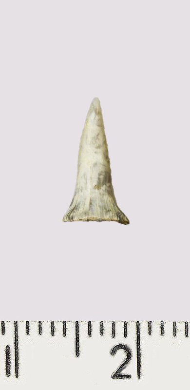 Зуб (фрагмент). Акула. Scapanorhynchus rhaphiodon Agassiz, 1843. Классификация: Хордовые Chordata, Позвоночные Vertebrata, Хрящевые рыбы Chondrichthyes, Пластиножаберные Elasmobranchii