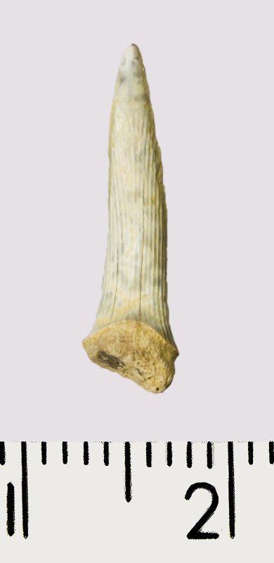 Зуб (фрагмент). Акула. Scapanorhynchus rhaphiodon Agassiz, 1843. Классификация: Хордовые Chordata, Позвоночные Vertebrata, Хрящевые рыбы Chondrichthyes, Пластиножаберные Elasmobranchii